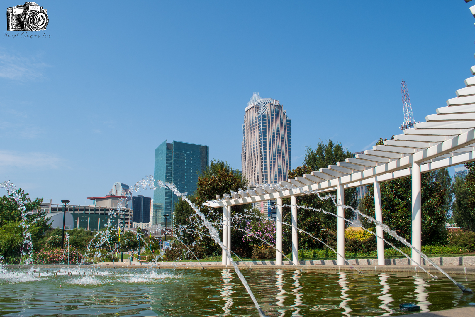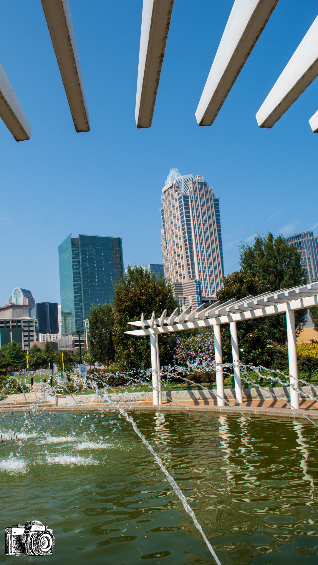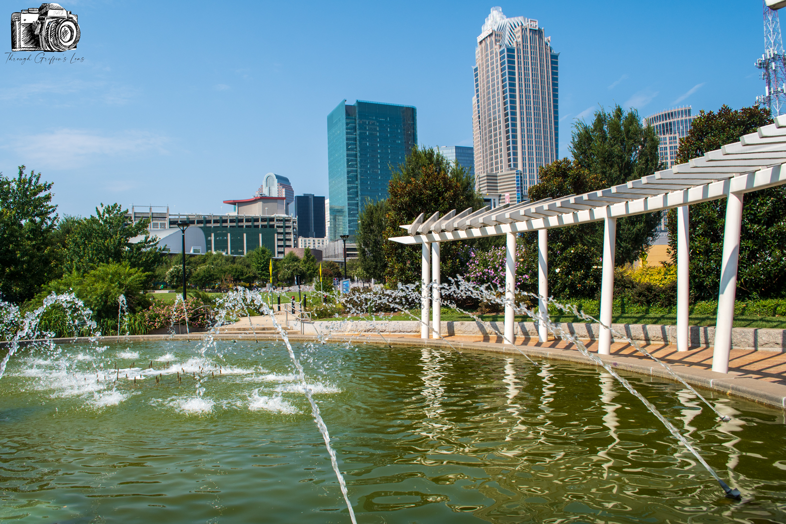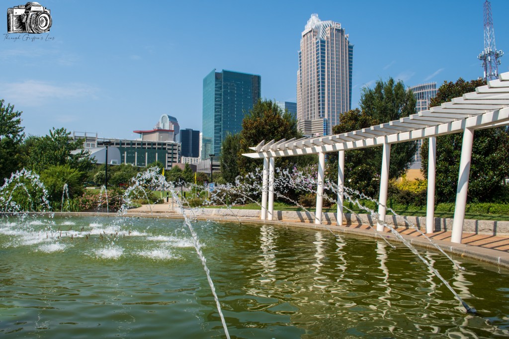 I took these photos on my last bike ride down to Uptown Charlotte. I finally had some time to go through and got photos ready to post just yesterday. I went over to First Ward Park, and it was a beautiful bright and clear morning. I set my camera up behind the fountain at UNCC Center City, and I was able to get this great view of Uptown Charlotte.
