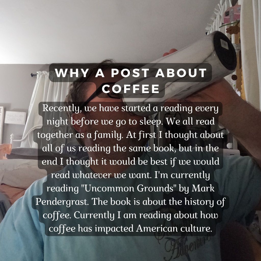 One of my favorite drinks is coffee. I really only drink three drinks regularly, coffee, tea, and water. The reason why I decided to post about coffee is because one of my goals for 2024 is to read more, and to get my kids off of screens as much as I can. Every evening, we take about 30 minutes and read together as a family. I am currently reading “Uncommon Grounds” by Mark Pendergrast. The book is about the history of coffee. It’s interesting to see how coffee has shaped moments in world history and world economics. Coffee is the 4th most traded agricultural product in the world.
