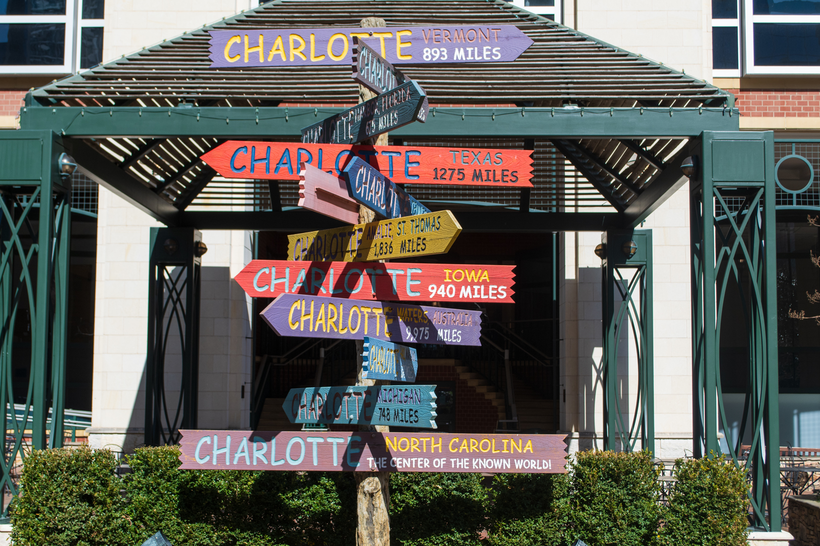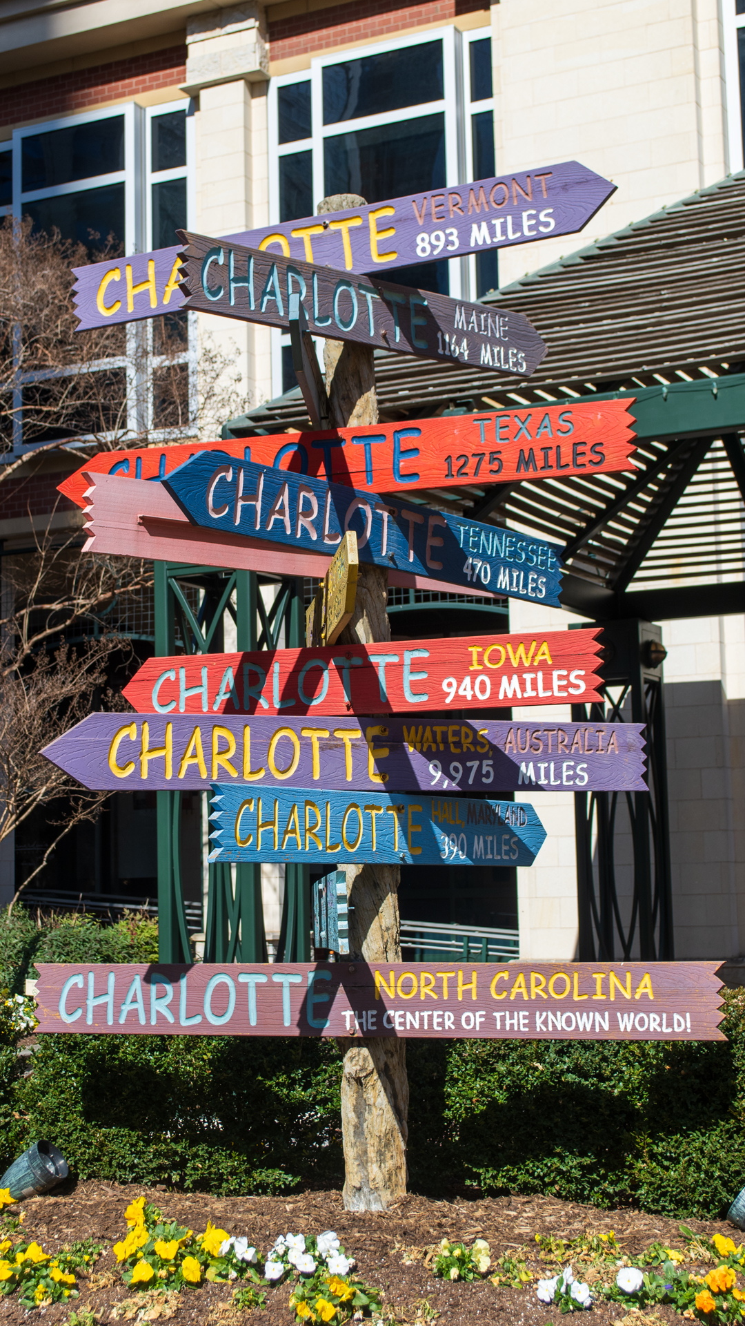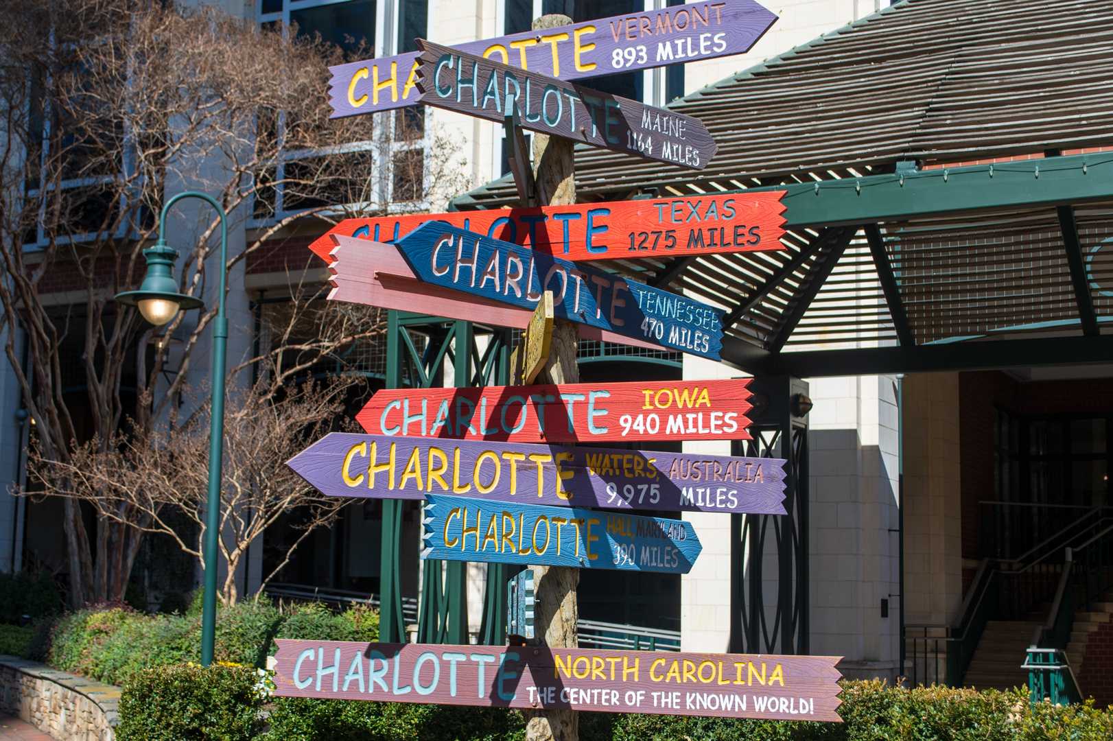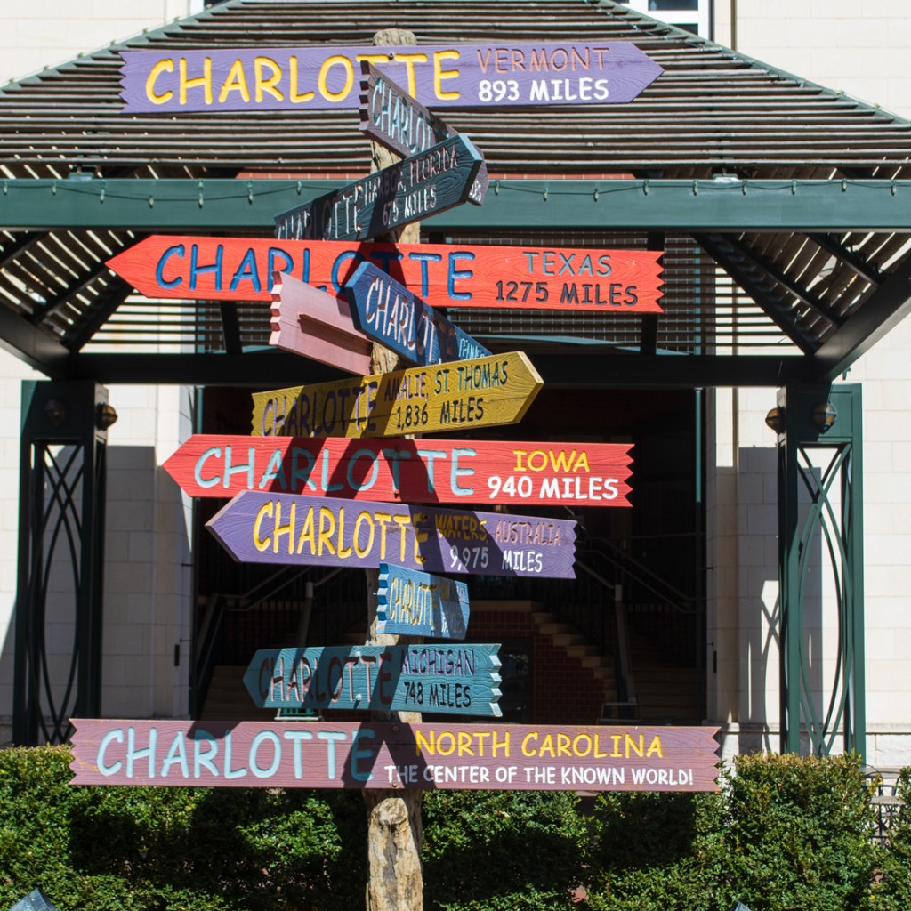 The whole idea about thinking about the center of the world came from my bike ride yesterday in Uptown Charlotte. Yesterday was the first time I had rode my bike since before Thanksgiving. It had either been cold, raining, or both since then. It was a little warmer yesterday, so I took advantage and rode more than 8 miles around town. I stopped to take photos of the trees blooming, Marshall Park, and I stopped by a park known as The Green. The Green is a literacy themed park dedicated to famous authors and their works. The goal of this park is to promote reading in the Charlotte area. I rode there hoping to see more trees blooming, but I was disappointed. I did take some shots of the Charlotte sign in the center of the park. This sign features the distance between here and other cities around the world with Charlotte in its name.