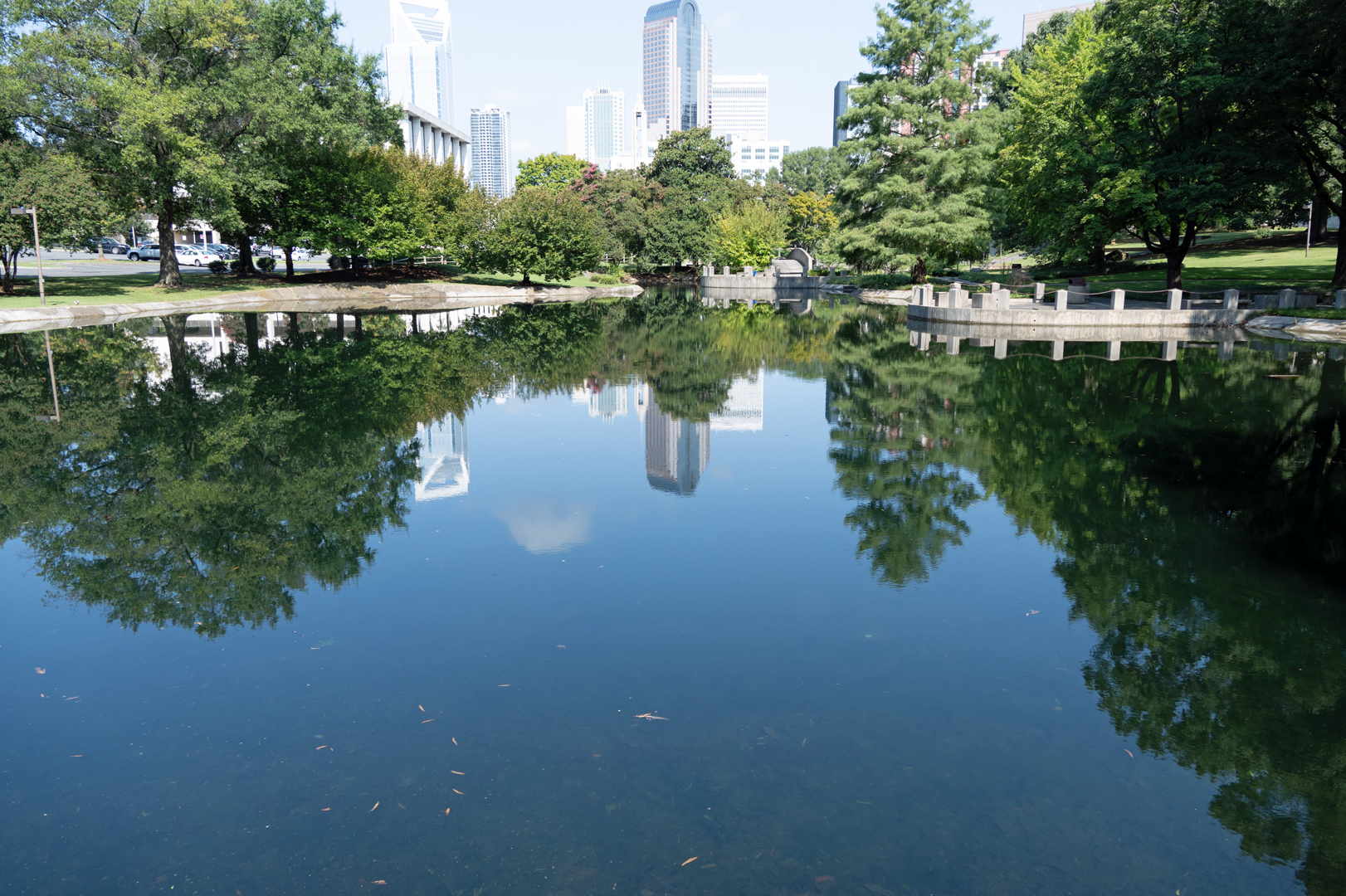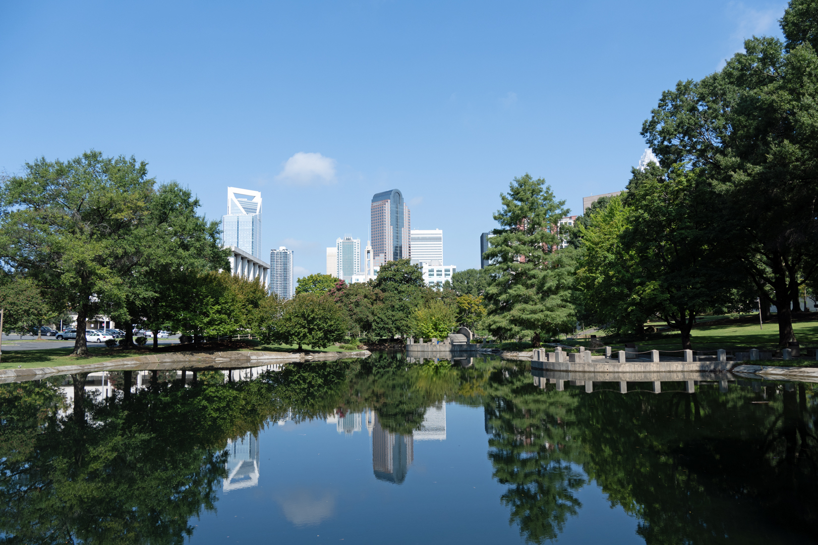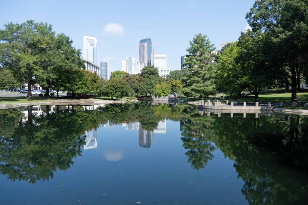 I took these photos last August while I was riding my bike in Uptown Charlotte. One of my favorite places to stop at is Marshall Park. Marshall Park has a great view of Uptown Charlotte, and on a clear and calm day you can see the reflection of the city in the pond.
