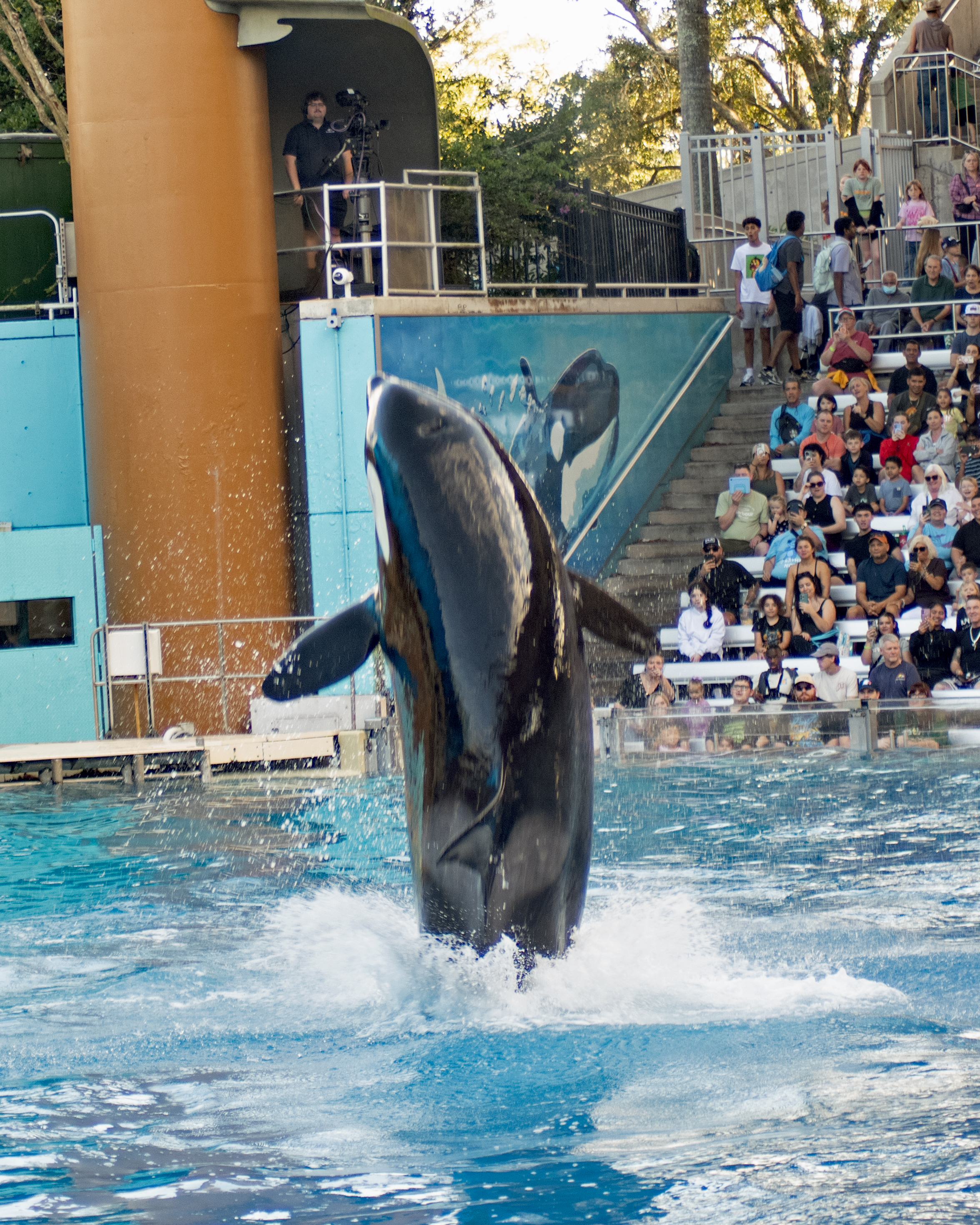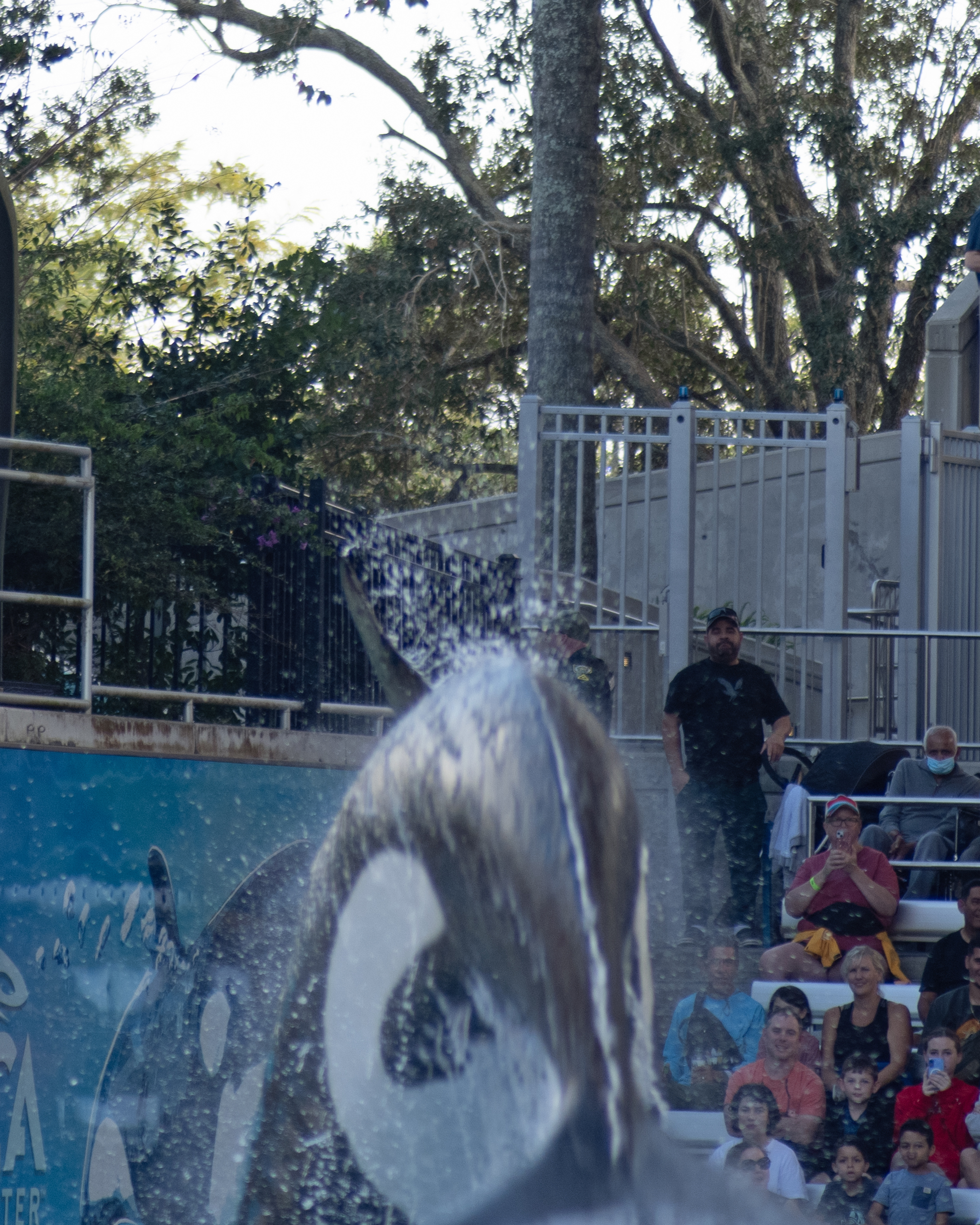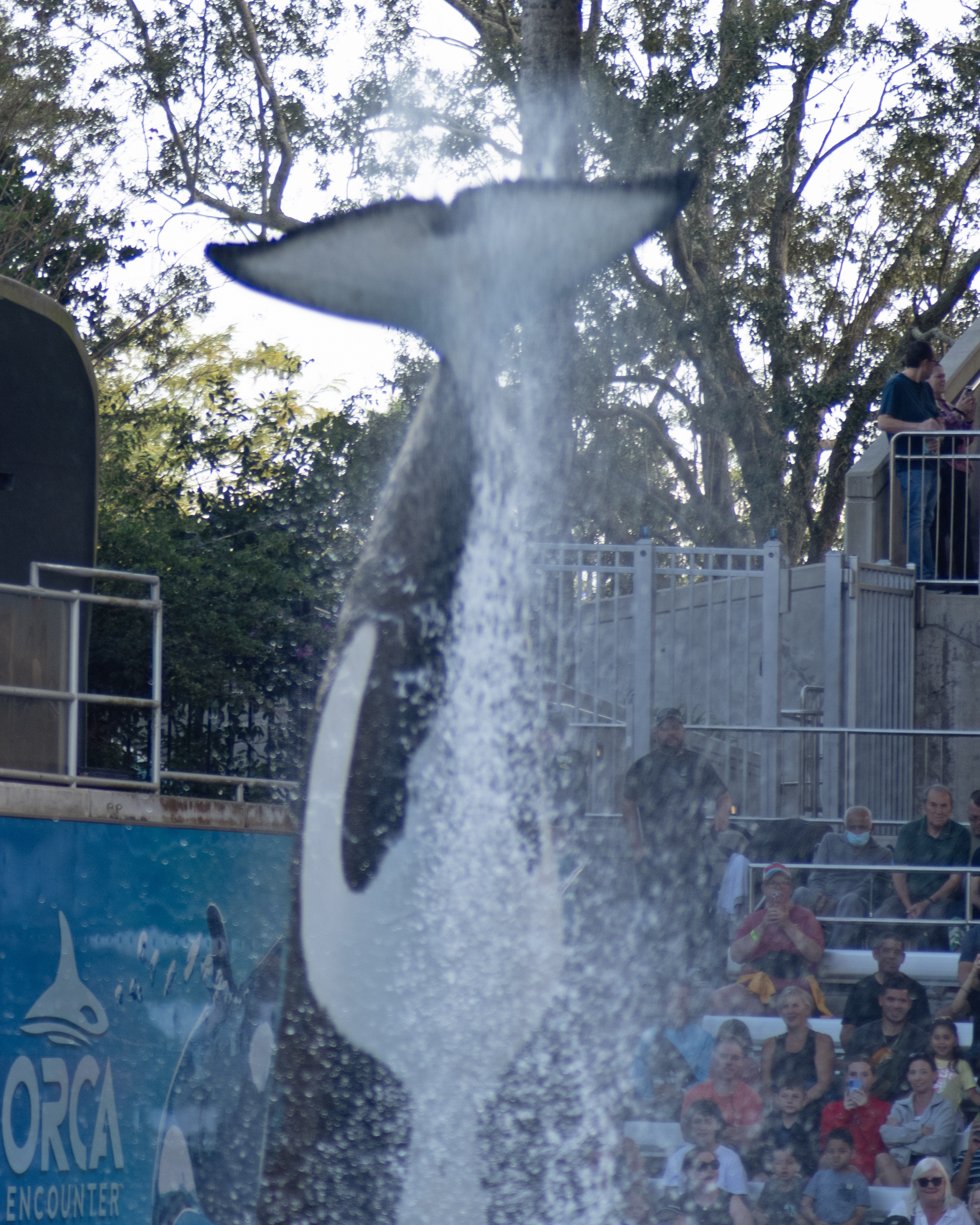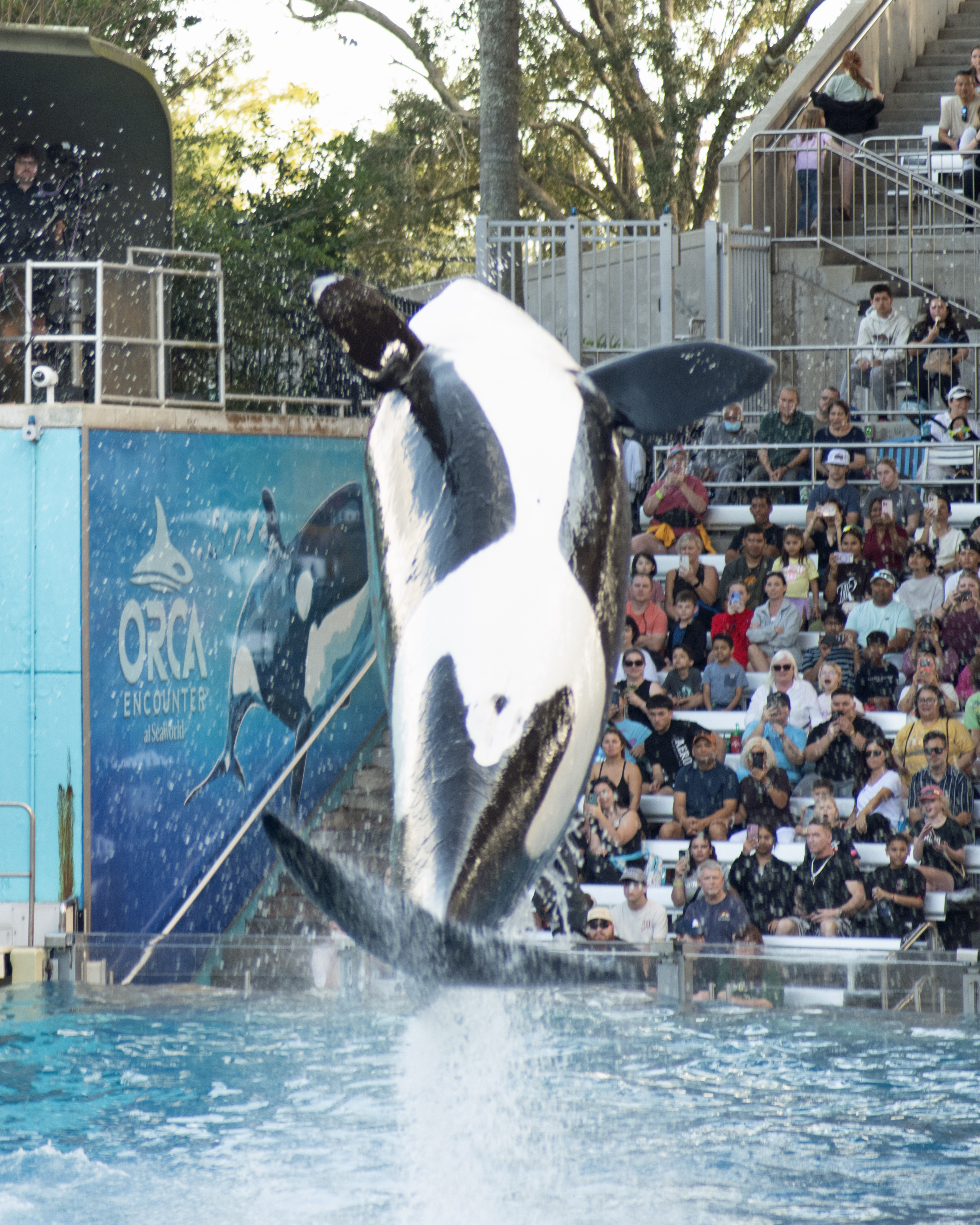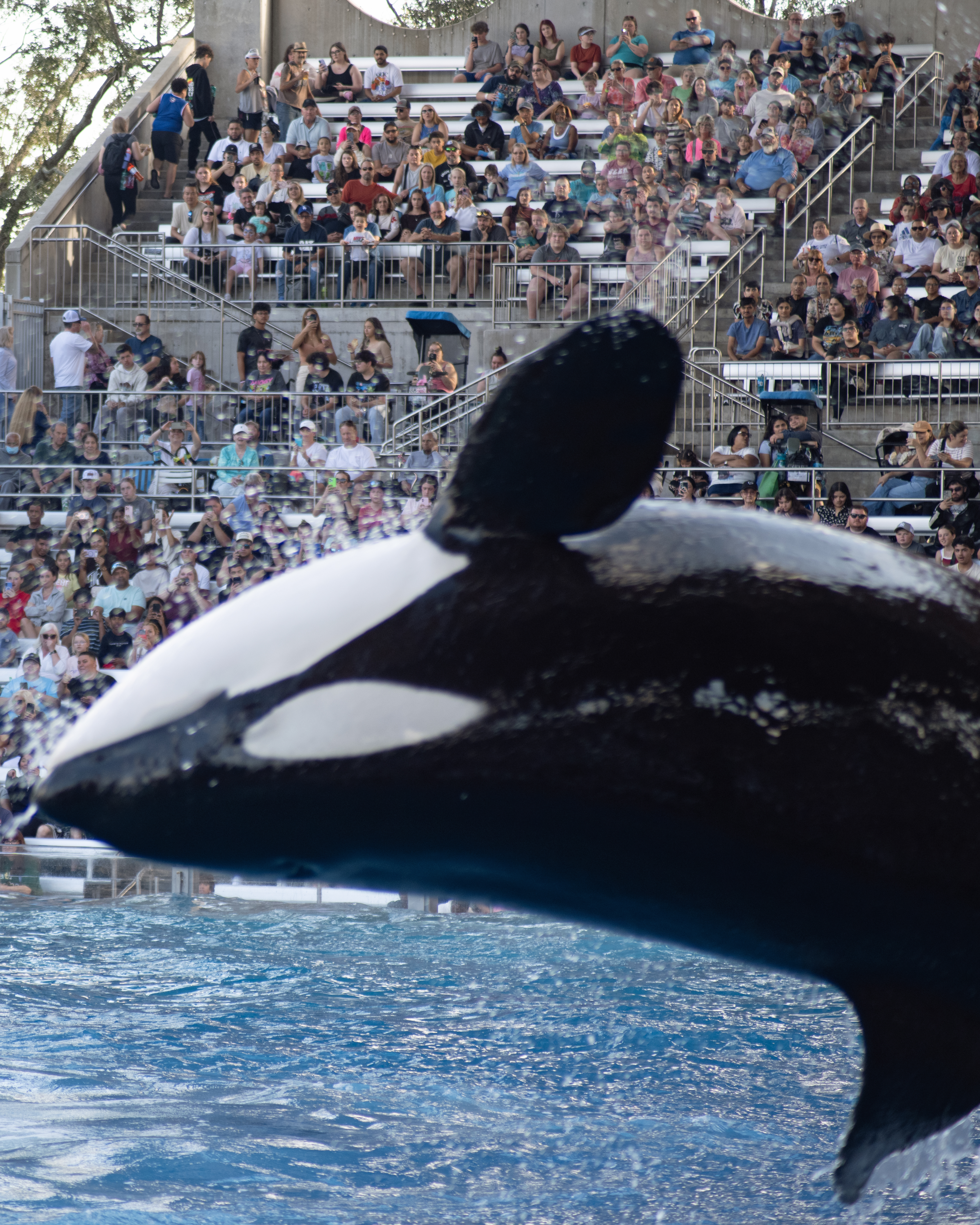 One thing I have been trying to do lately is get better with using the settings on my camera. I dislike one thing about my camera. When I turn it off, all of the settings reset. I am still working on how to get that right. One thing I did get right was to cut on continuous focus while capturing photos of moving objects. The Orca’s at Seaworld don’t really stand still. The place where they preform is called the Orca Stadium, and that place was packed when we went. In fact, SeaWorld was full of people the day we went. We sat in an area called the splash zone. I’m sure that meant there was a chance that you could get wet. I got a little nervous with having my camera out, but I wanted to get some good shots. I had my bag ready. I could put it back in a hurry. That was in case the splash zone lived up to its name. Fortunately, it didn’t. I was able to capture some great shots of the Orca’s. They performed in front of us.