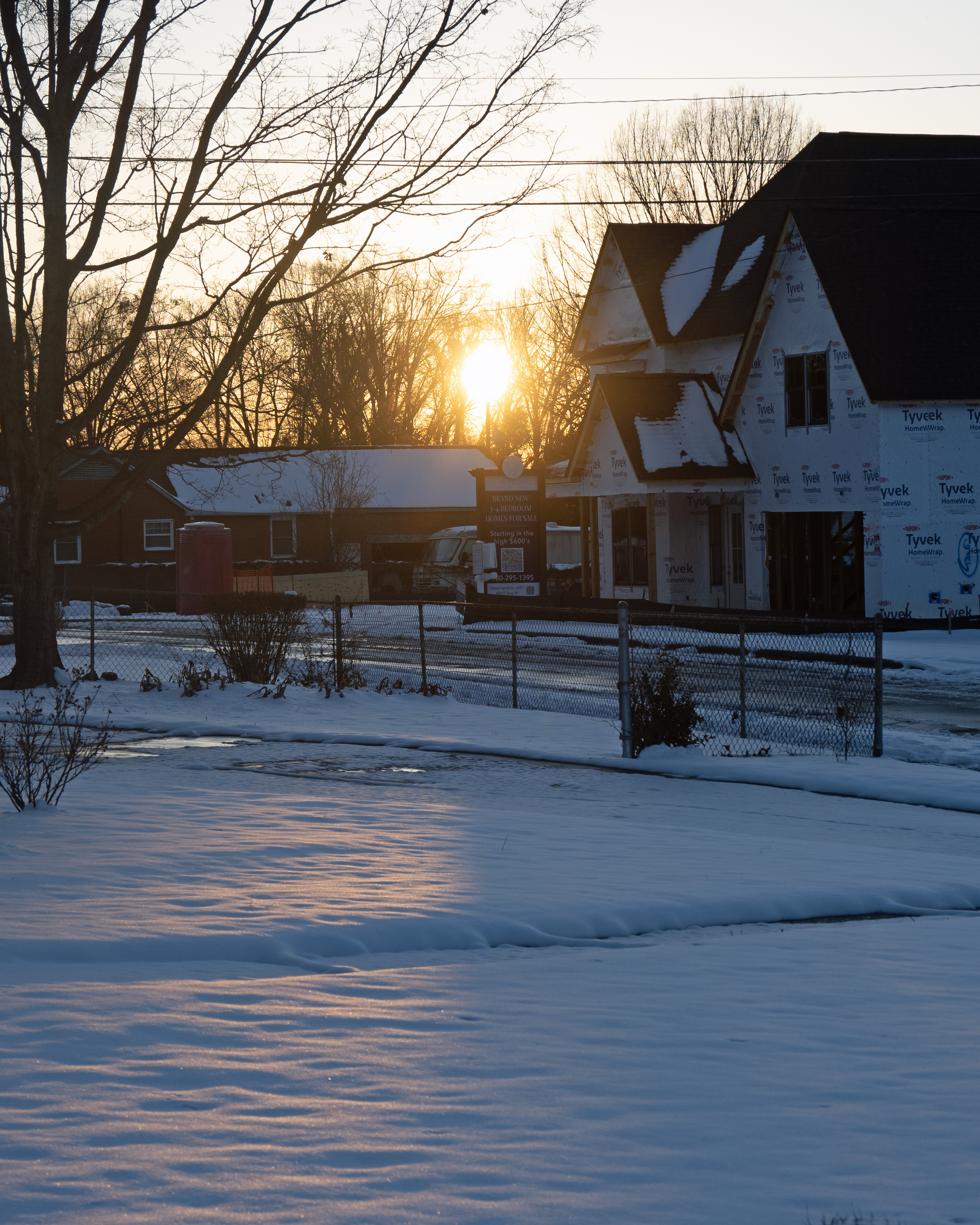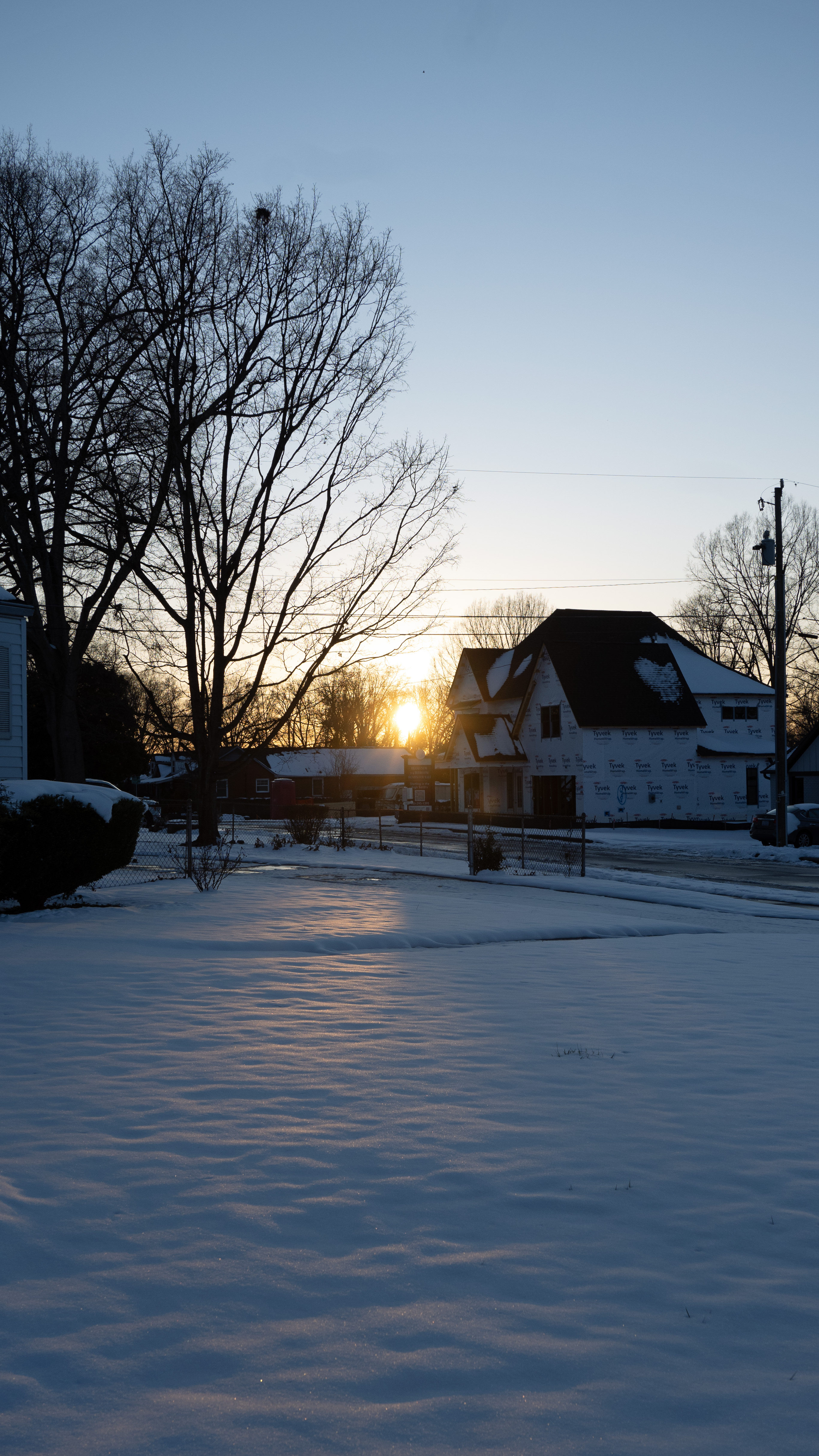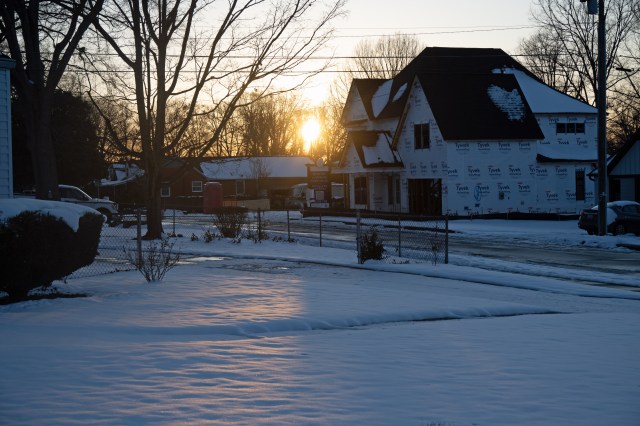 During one of my snow walks, I did some street photography around my neighborhood. I hadn’t done this in a while, and I enjoy capturing photos of random people. While the places I walk always look the same, the people you see are always different. I wanted to see how everyone was faring in the snow. I walked over to a coffee shop about a half a mile from my house. I grabbed a coffee while I was there to get a quick warm up. I captured photos of every one who was out walking their dogs or just trying to get some time outside. After getting some shots, I put my camera away, and started to head back to the house. I made it back to my house right at sunset. When I walked up to a neighbors house, I could see the sun starting to set right over their yard. While it wasn’t the perfect landscape with all the construction in the background, it was still a great golden hour. I grabbed my camera, and snapped some shots of it before heading back to the house.